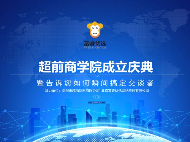 2017年04月19日,超前商學院成立揭牌啟動大會在鄭州隆重召開,鄭州市超前涂料董事長、北京富睿優選選董事長—閻運鋒,人社部高級人力資源管理師、WFA國際促動師協會行動學促動師—代志杰,中國智慧策略應用專家、企業運營管理專家、飛漲策略(北京)品牌管理有限公司董事長—董建明等50多位企業家與公司員工出席本次活動。